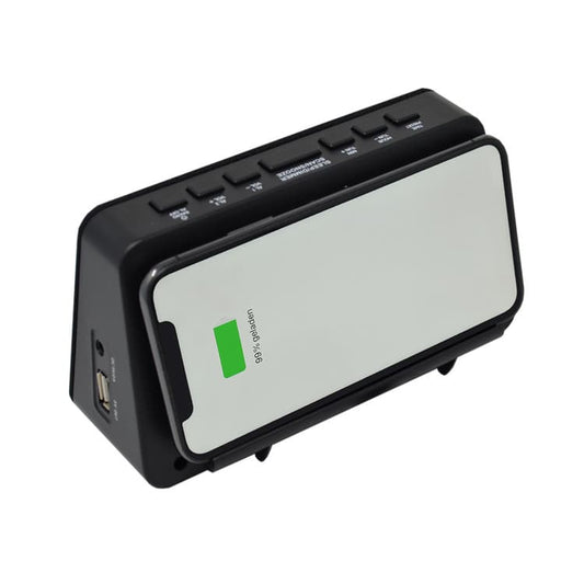 AIC - Radioreloj Despertador FM con Base de Carga inalámbrica QI para móviles, 10 Emisoras, Función de Alarma dual, Puerto de Carga USB, Atenuador "dimmer" de 3 pasos. Mod. WM3020i